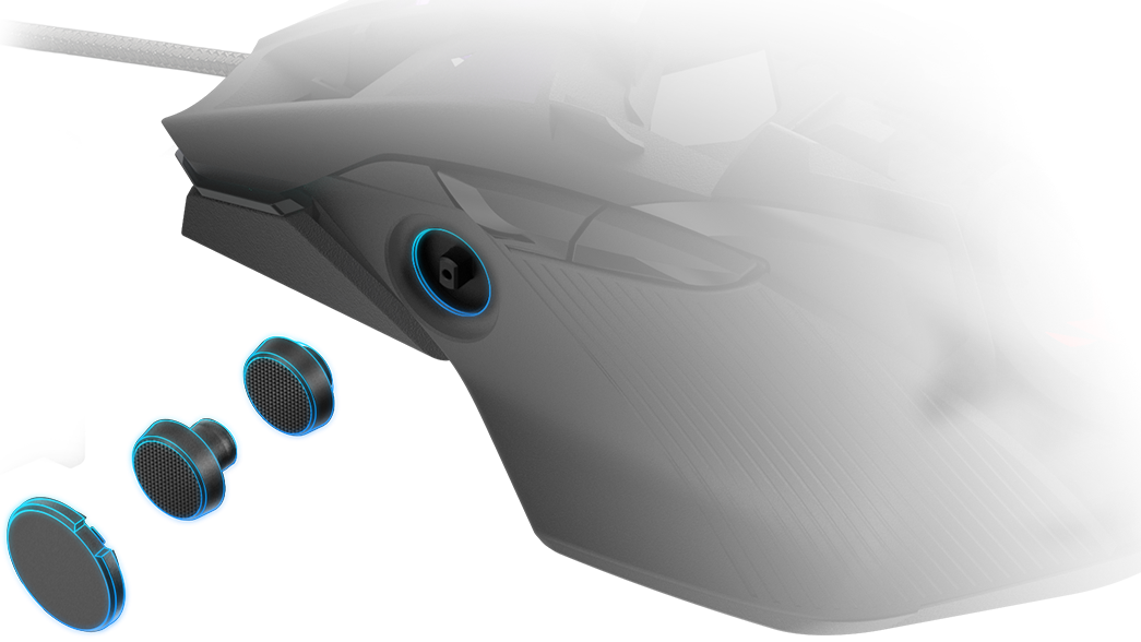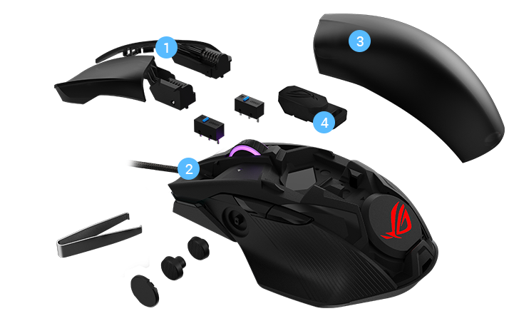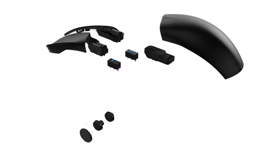 - Konstrukcja bez śrub z magnetycznymi przyciskami i pokrywą zapewnia łatwy dostęp do gniazda przełączników o ekskluzywnej konstrukcji typu Push-Fit opracowanej przez ROG, jak również zmianę masy myszy